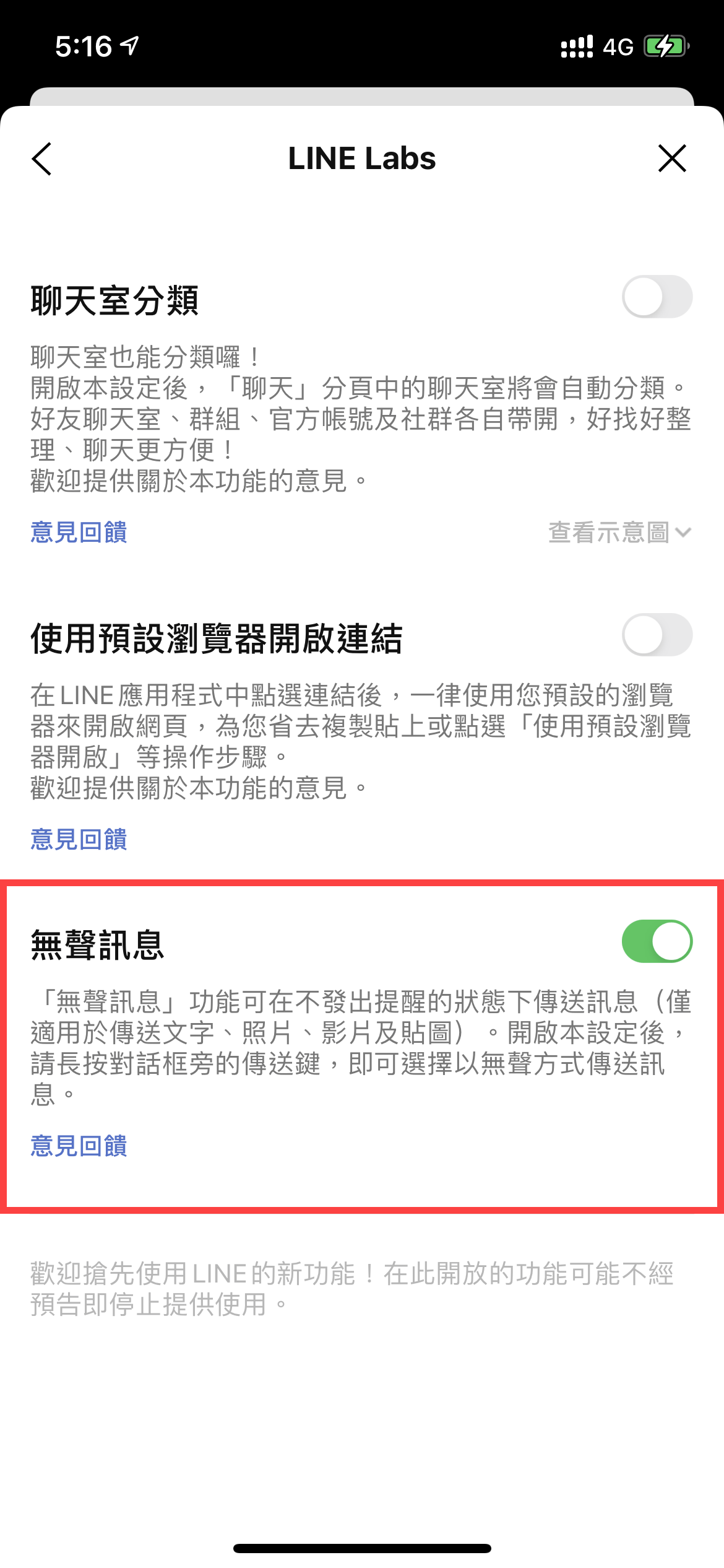 Line Labs 無聲訊息 不發出提醒傳送訊息發布時間: 2021-07-13 11:00:00 2025-08-25作者:Jin分類:數位生活/LineLine Labs 推出了一項功能「無聲訊息」,能夠在開啟的情況以不提醒的方式傳送訊息,即使是 iPhone 本身未開啟勿擾模式,也能夠不發出提醒的狀態傳送訊息給其他人。廣告載入中...使用系統:iOS 14.4使用版本:Line 11.1.0開啟 Line 後點選右上角的「設定」按鈕。點選「設定」內的「Line Labs」。進入後將「無聲訊息」開啟。(傳送訊息時對方不會收到提醒)開啟「無聲訊息」功能後使用方法很簡單,「長按」傳送訊息按鈕就會出現「無聲」、「正常」訊息傳送。延伸閱讀Google 相簿封存檔案服務將於 7/19 停止iPhone 語音隔離 讓通話時更清楚 使用方法教學Line 傳送照片關閉預設 iPhone 傳送 Live 模式(原況照片)照片格式 TAGS:#Line喜歡這篇文章嗎?你的支持是我們最大的動力,歡迎分享文章!FacebookThreads上一篇文章下一篇文章 文章作者 文章一覽表 Jin 902 篇文章Jin 為《IN閱誌》網站管理者,專注於撰寫 Apple 技巧、3C 科技、動漫、日本文化與旅遊 等主題。以淺顯易懂的角度,分享專業見解與實用資訊。 相關文章 數位生活 Google Doodle 慶祝《小精靈》45週年 推出萬聖節限定版遊戲 數位生活 Grok 推出伴侶模式!虛擬角色 Ani 可語音互動 NSFW 隱藏功能引發熱議 數位生活 YouTube 宣布將移除「Trending 發燒影片」頁面 數位生活 YouTube 宣布 7/15 更新政策 非原創、真實內容將無法營利 數位生活 Threads 新功能防止劇透使用方法教學 數位生活 LINE 2025 母親節聊天室特效登場!輸入「媽媽」或「愛你」熊大持康乃馨現身 載入更多文章