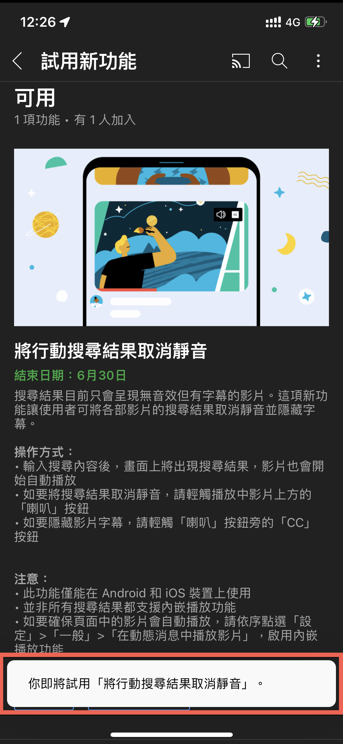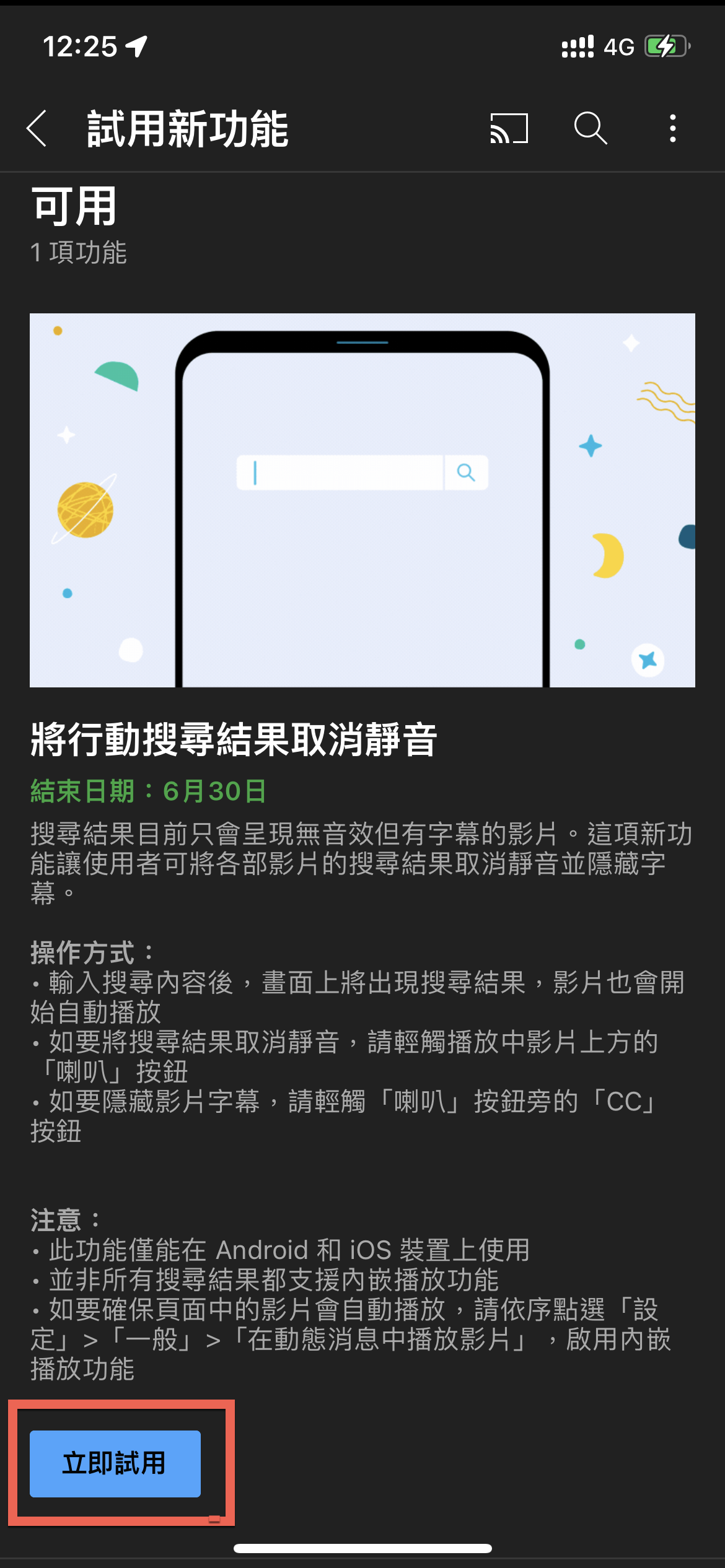 然後在【將行動搜尋結果取消靜音】開啟【立即試用】。