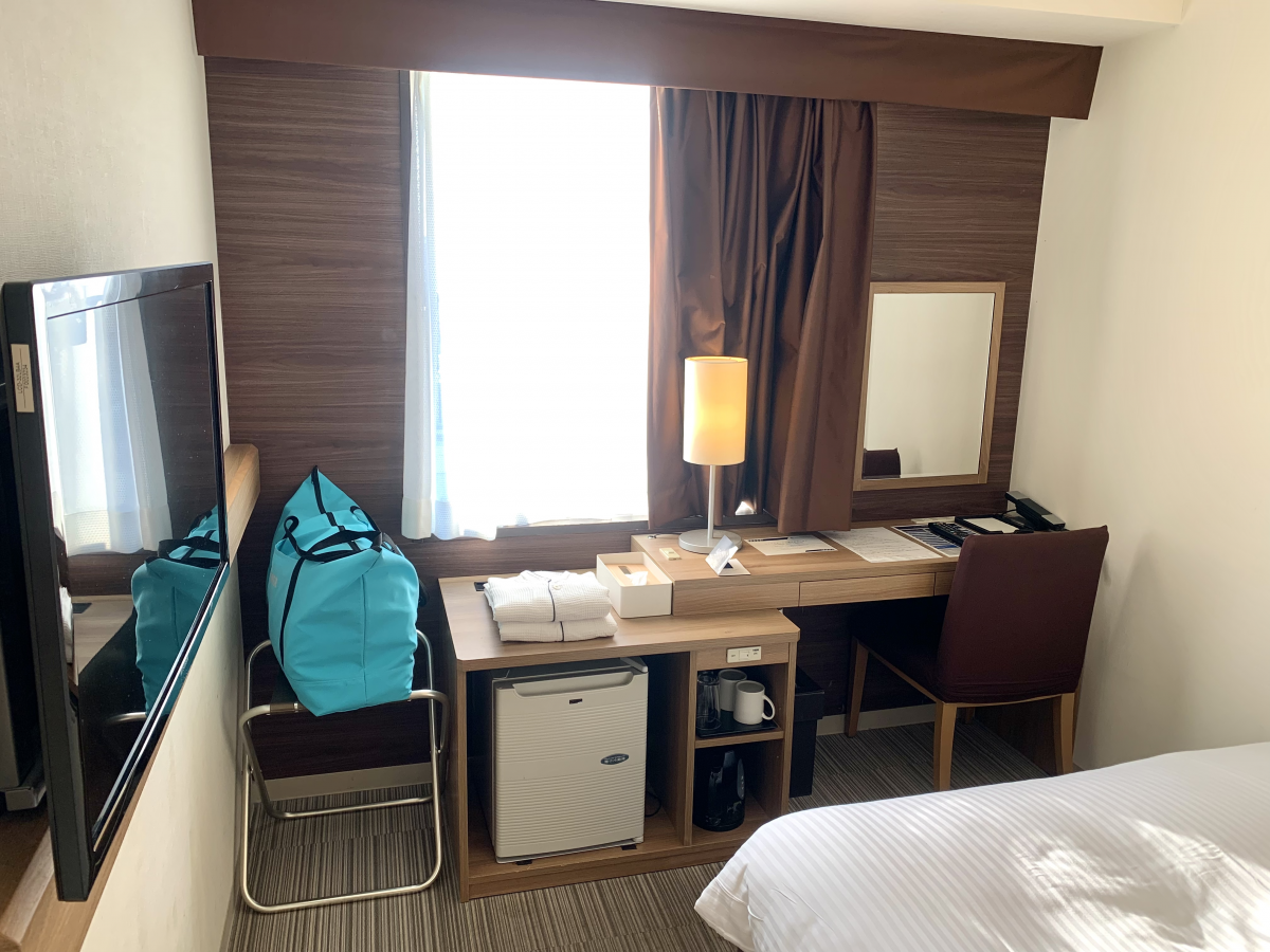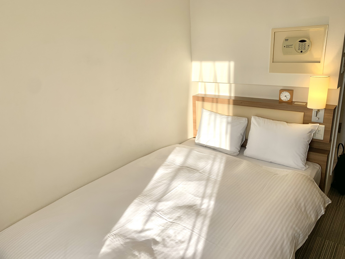 基本上這是一間商務旅館,房間本身就不是很大,床是一般尺寸的雙人床,兩個人睡剛剛好,但放行李箱的話,兩個大行李箱就差不多擠了。