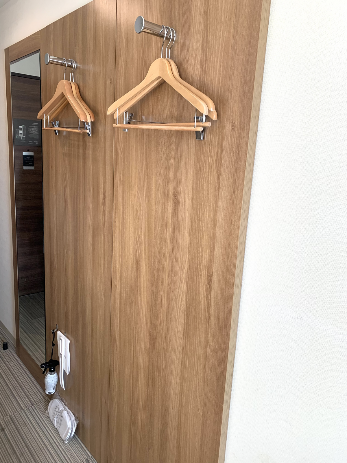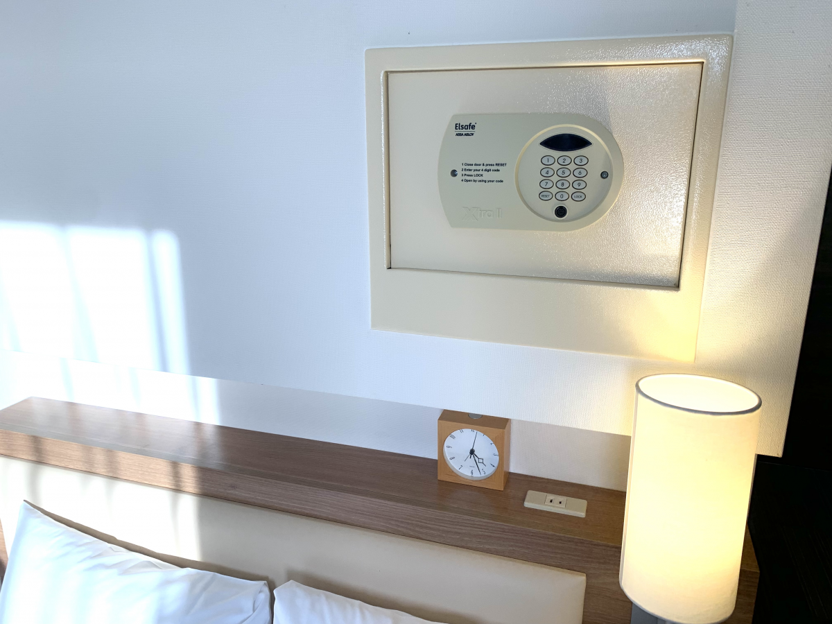 沒有衣櫥,但牆上還是有衣架可以掛外套,床頭部分有保險櫃跟一個小鬧鐘,房間內有小冰箱、快煮壺、馬克杯、玻璃杯、睡衣、室內拖鞋、消臭劑,如果要使用冰箱的話,要記得先把冰箱電源打開,房間內也有附 Wi-Fi。