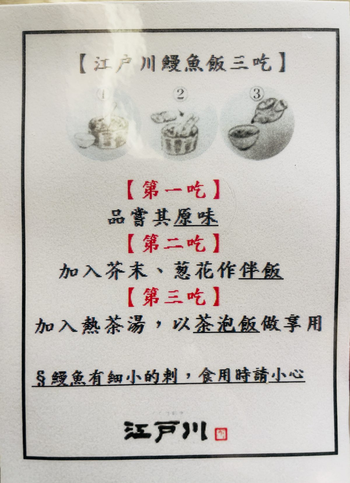 《鰻料理江戶川》會提供鰻魚三吃的步驟。