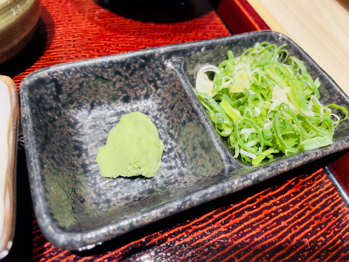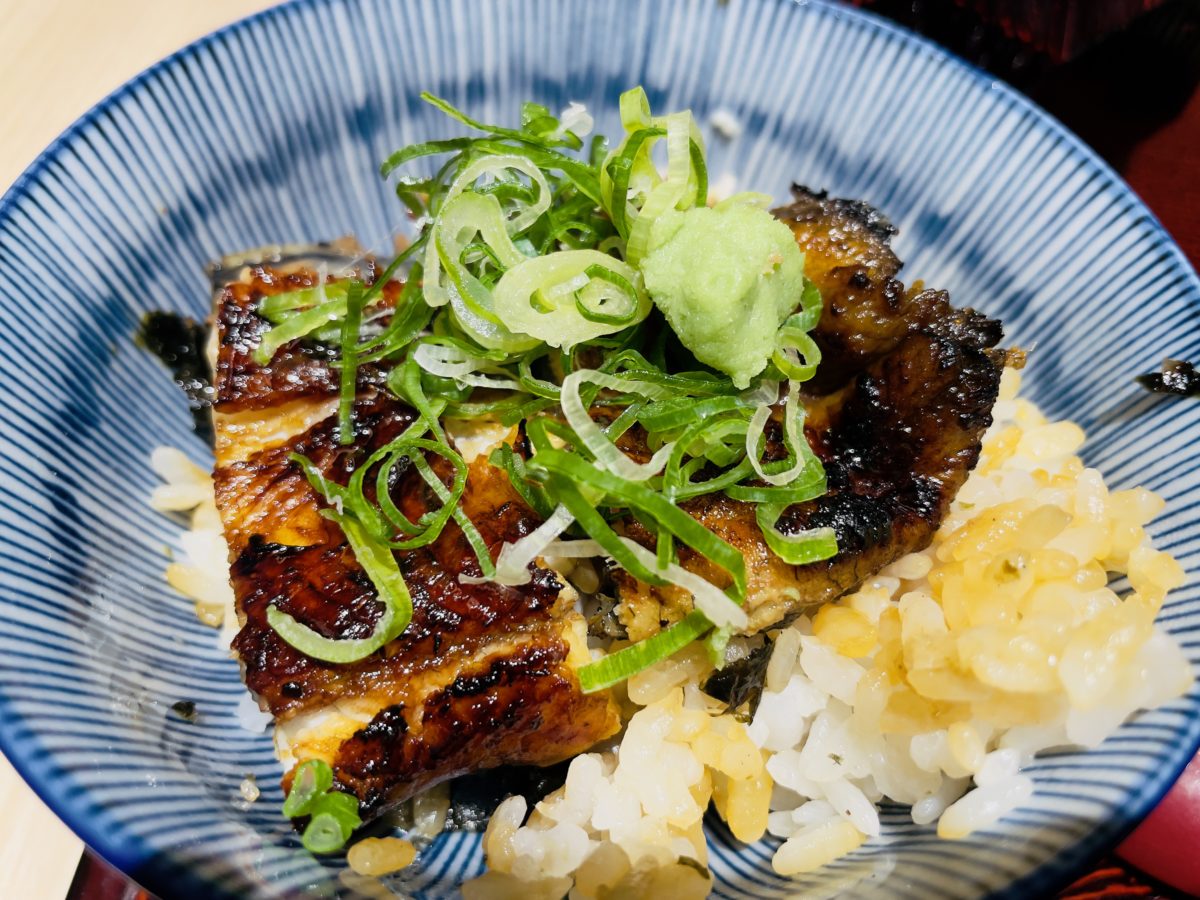 鰻魚飯,漬物、芥末、蔥花。