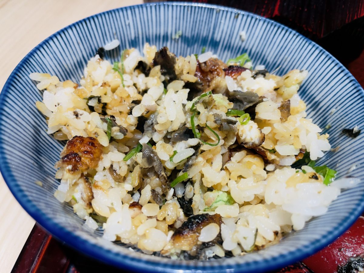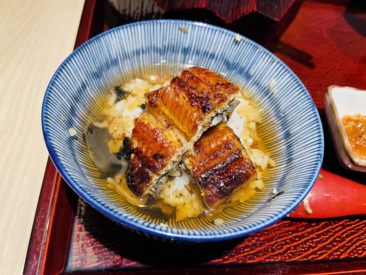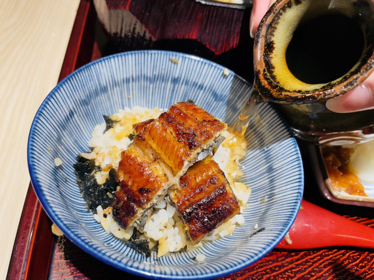 三吃,鰻魚飯加入茶高湯就可以當做茶泡飯吃,也可以加入蔥花及芥末後再加入茶高湯,依照個人口味進行食用。