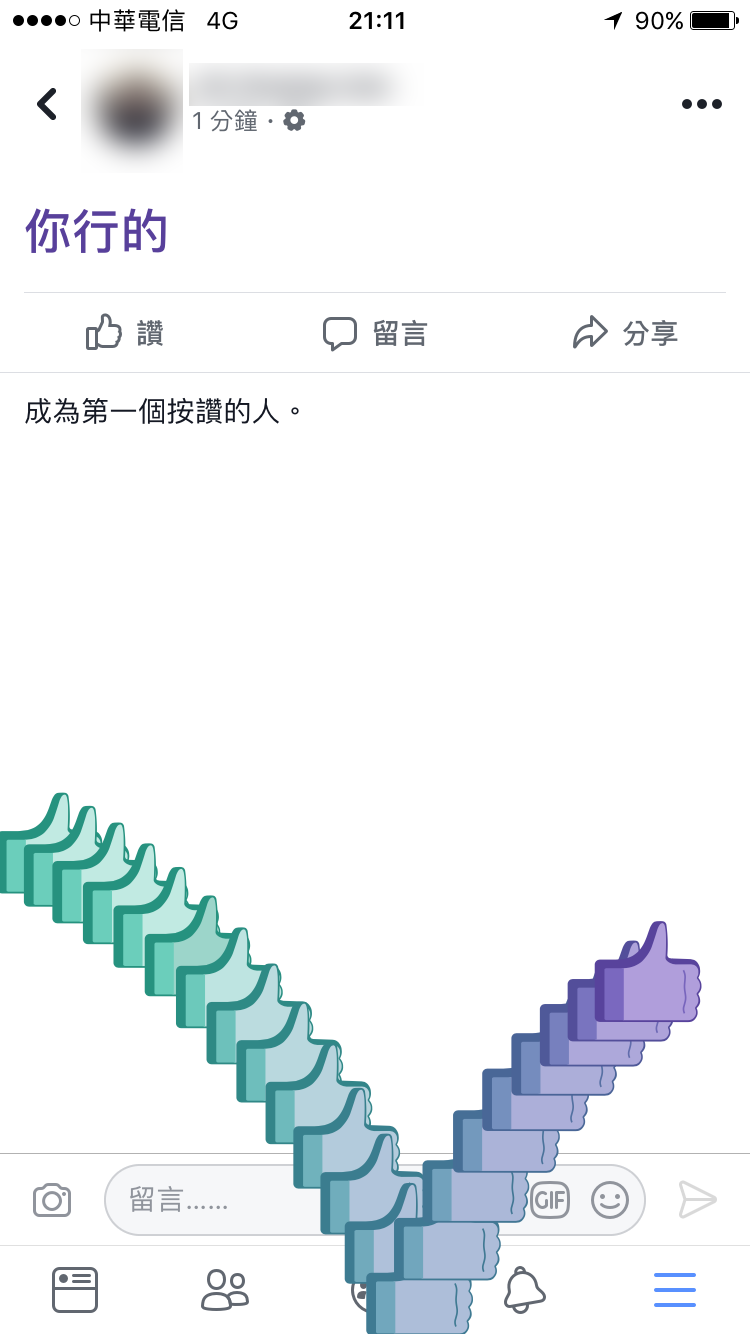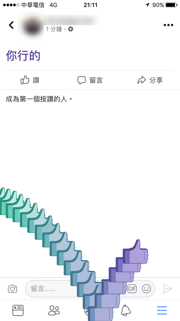 FB 一直以來都有許多驚喜彩蛋,這次只需要在 FB 動態消息或者朋友輸入留言「你行的」這三個字,就會有一個M字讚從左到右出現!甚至是連 iPhone 上的 FB App 上也能看到這項特殊效果哦!可以試試看用這個效果或者鼓勵朋友哦!