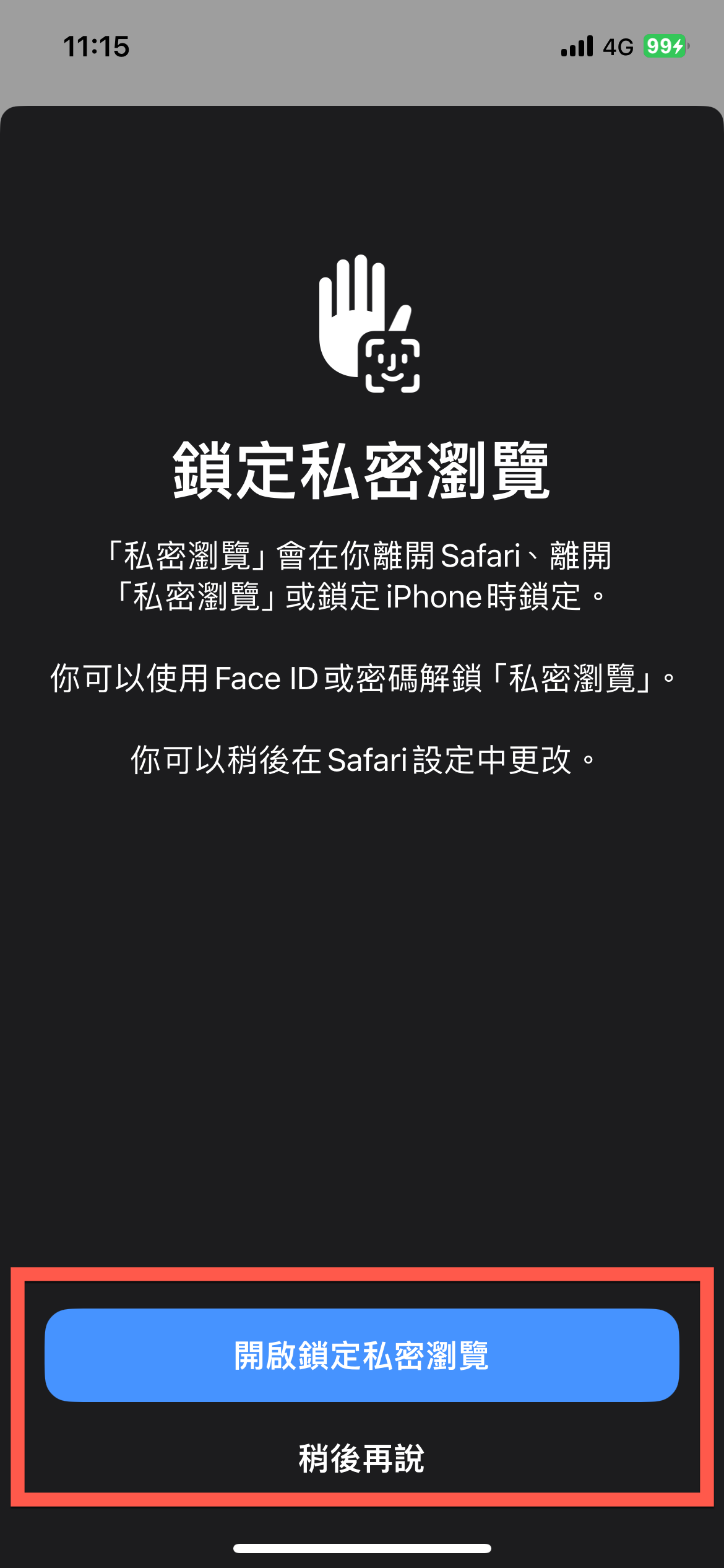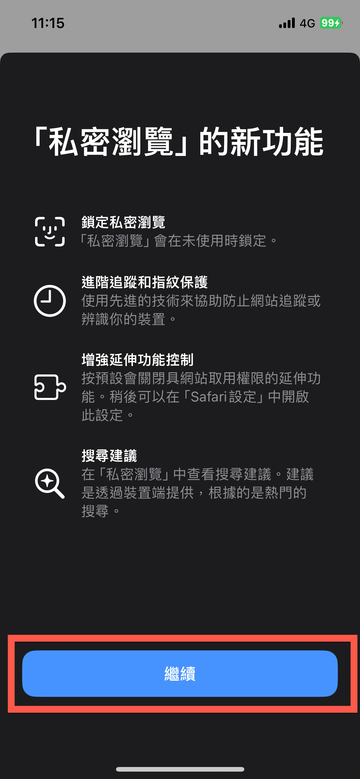 更新後開啟 Safari 之後可以觀看目前新增的功能,點選繼續後就會出現是否要【開啟鎖定私密瀏覽】功能,可以點選開啟或者稍後再說,如果已經開啟想關閉的使用者也可以觀看本篇文章後面的教學。