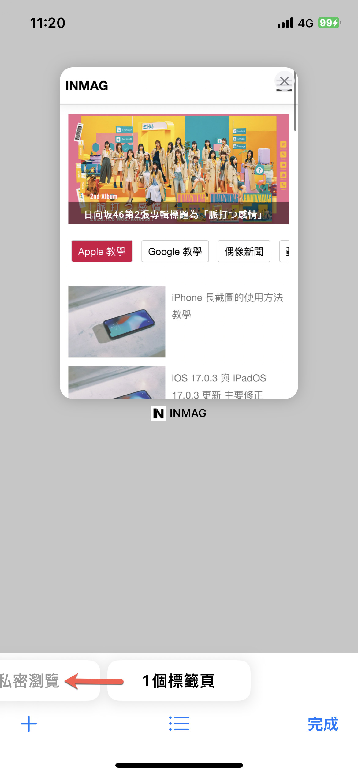 開啟之後進入到 Safari 後點選右下角的【分頁按鈕】,然後往左滑就能夠找到【私密瀏覽】。