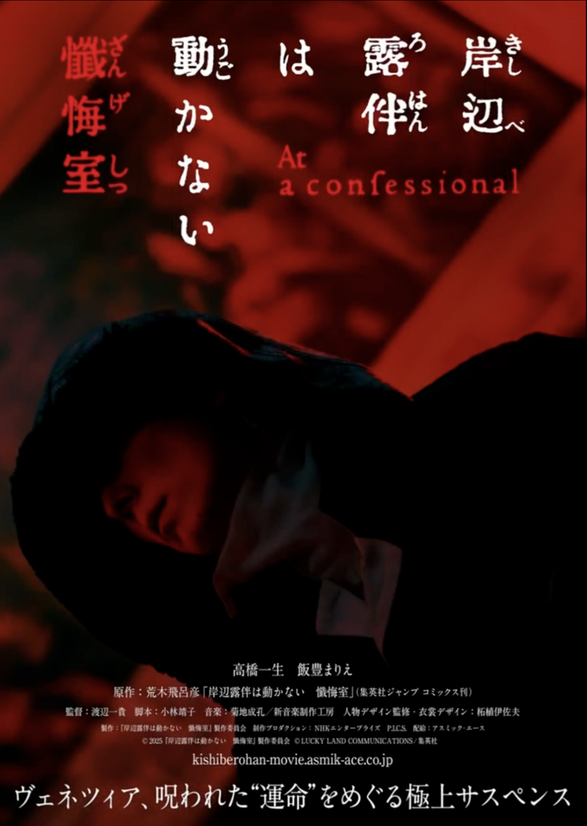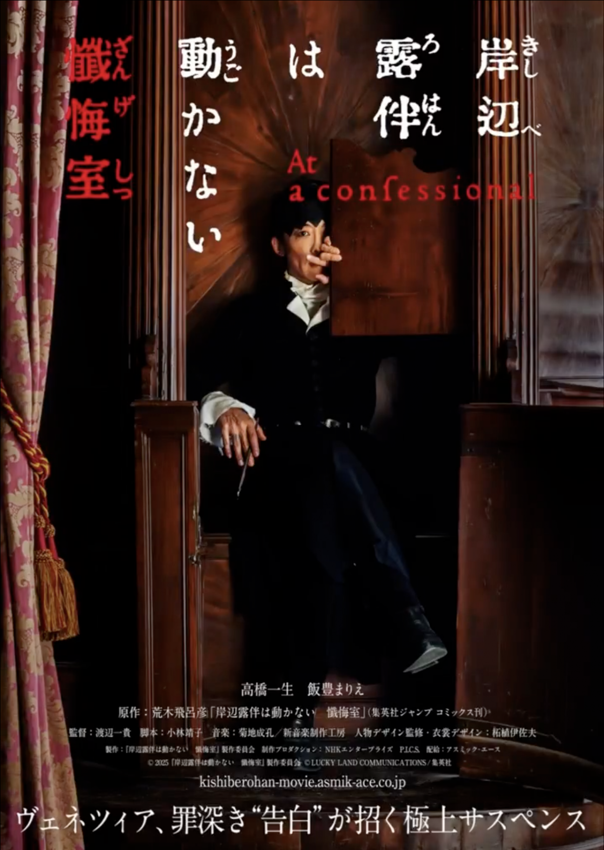 日本漫畫家荒木飛呂彥《JOJO的奇妙冒險》系列衍生作品《岸邊露伴一動也不動》,由高橋一生與飯豐萬理江(飯豊まりえ)合作,由高橋一生飾演岸邊露伴,飯豐萬理江飾演露伴的漫畫編輯泉京香,繼之前推出《岸邊露伴在羅浮》(岸辺露伴 ルーヴルへ行く)電影後,將於日本2025年5月23日推出新作電影《岸邊露伴一動也不動 懺悔室》(岸辺露伴は動かない 懺悔室),本作電影全片取景於義大利的威尼斯。