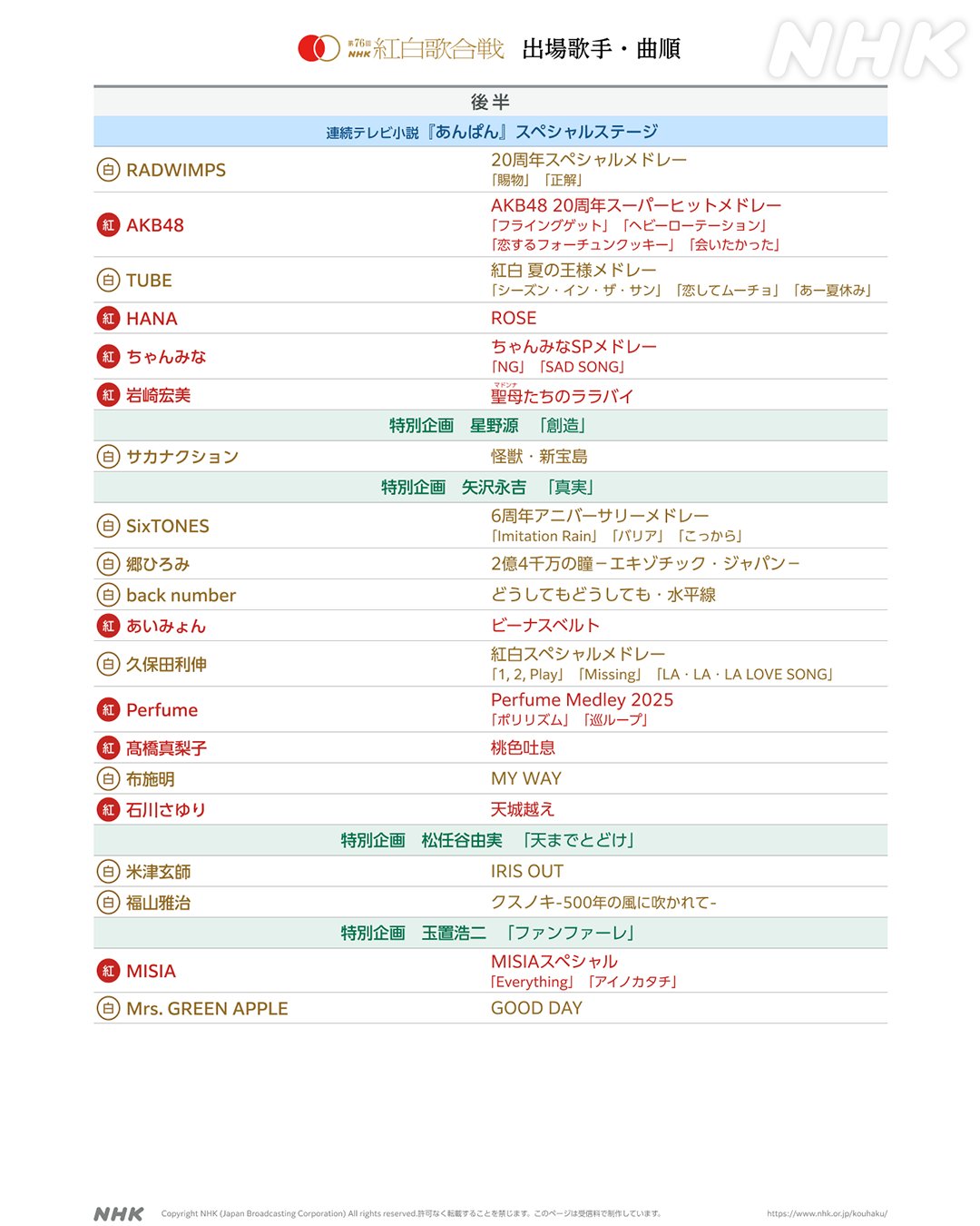 NHK第76屆紅白歌唱演出者與歌曲順序